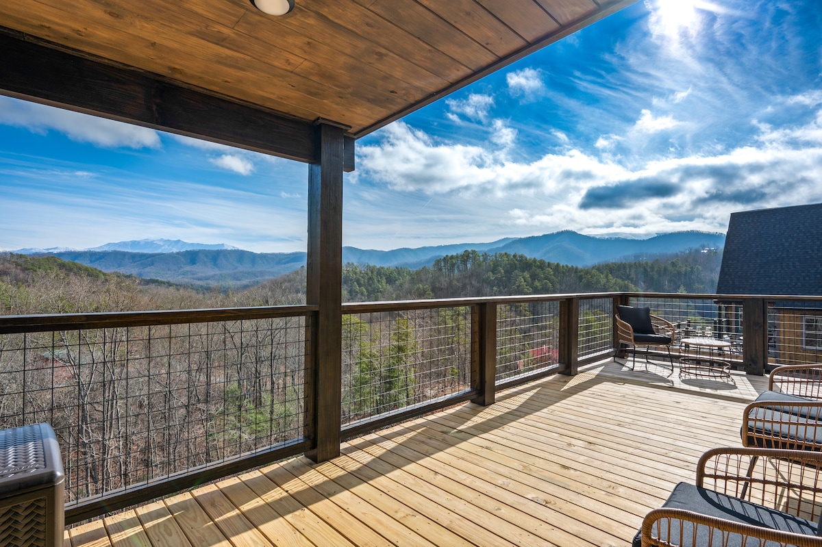Lavish in luxury at this handcrafted log mansion w/ 180° of breathtaking Smoky Mountain vistas, 4bd/4b, featuring: • 4 KING MASTER SUITES, each w/ own bathroom • SAUNA — a rare amenity! • HOT TUB & full length deck — south facing for stunning sunrise & sunsets! • GREAT ROOM w/ cathedral ceilings, fireplace, banquet table, & stocked island kitchen • Air Hockey, Pool Table, Poker table, 6 Roku TVs, & 50mpbs WiFi • Charcoal grill & Patio w/ outdoor furniture • Only 30min to Dollywood & Pigeon Forge