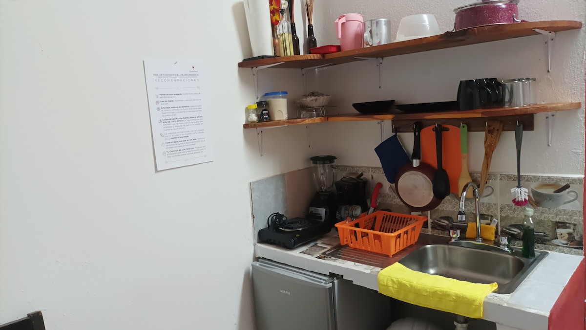 Fully equipped private and cozy Bungalow, 1 bed, Kitchenette, Bathroom, Hot Tub. Garden, Terrace and Swimming Pool can be used. Bungalow privado super equipado, 1 cama, Cocineta equipada, Baño Completo, Tina de Hidromasaje. Uso Jardin, Palapa y Alberca. Cocina exterior con lo básico para cocinar, sal, aceite, azúcar, pimienta etc.