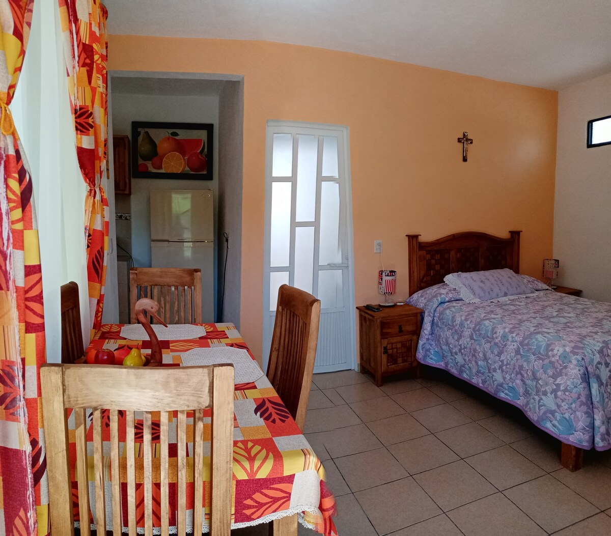 NO ESTAMOS EN EL CENTRO Pequeña pero acogedora suite privada con cocina, baño y estacionamiento exclusivo, elementos básicos para pasar una estancia agradable en Tequisquiapan, dentro de una propiedad ubicada a 1.2 km de la Plaza principal del pueblo y a 4 cuadras de la carretera San Juan del Rio-Xilitla. No es fraccionamiento ni zona residencial, es una colonia tranquila, serás nuestra prioridad! "Ideal para dos personas, Pero en el sofá cama puede quedar un tercer huésped."
