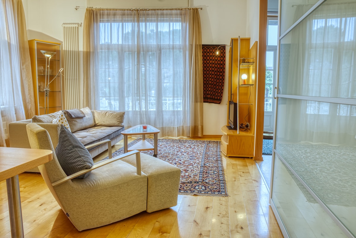Renovated spacious apartment (74 square meters) with air conditioning (pedestrian zone). Hallway, bathroom, living room (full-size sofa bed), fully equipped kitchen, bedroom (double bed) with desk. Ideal for couples, families, business travelers + solo travelers. Right in the center: 2-minute walk. Thermal baths, spa house, city theater, old town Bars, restaurants, supermarket, bookstore,… directly on site. Public parking is available in the immediate vicinity. LOCAL TAX: to be paid on site. Person/night €2.20 (free up to 14 years)