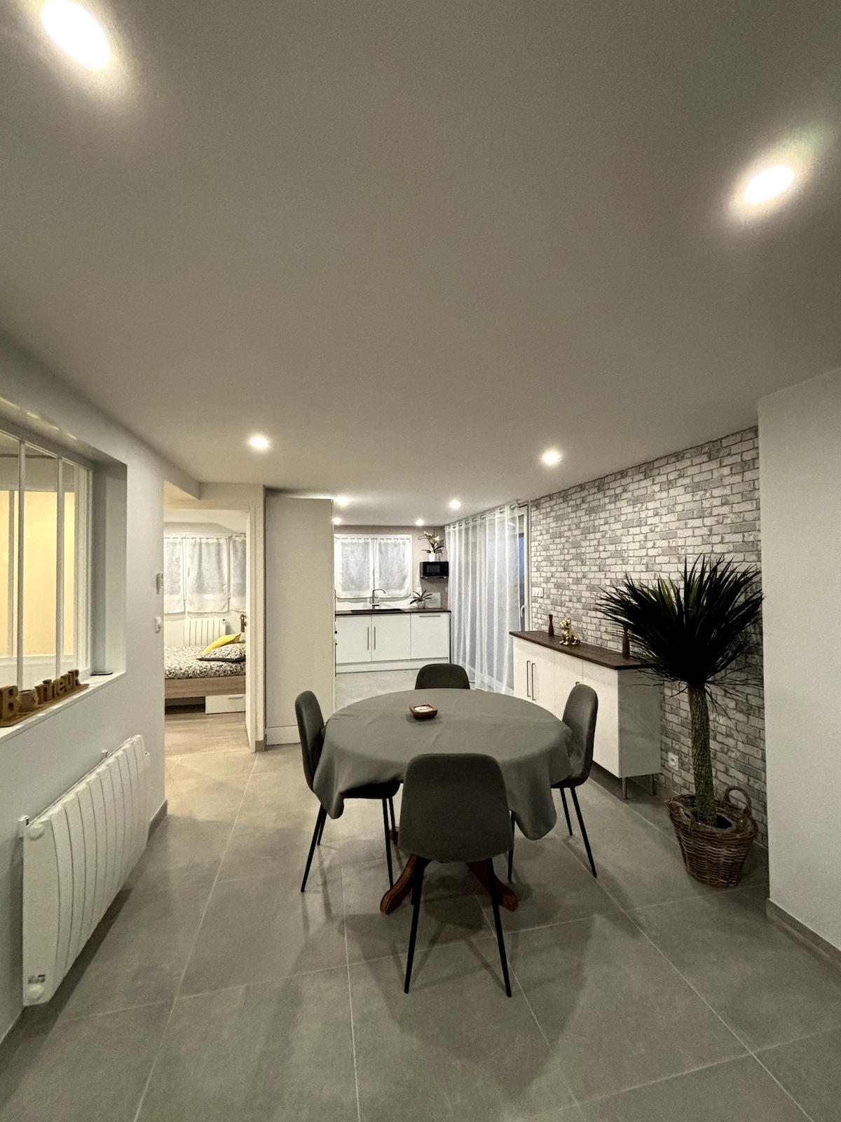 Appartement de 90 m² au rez-de-chaussée de notre maison, situé à 13 km de Lyon, avec 2 chambres dotées de dressings, 4 lits, 2 salles de bains, 2 toilettes, et une cuisine moderne équipée d'un frigo-congel, plaque de cuisson à induction, four, micro-ondes, cafetière (Senseo) et lave-vaisselle. La cuisine est ouverte sur le séjour/salle à manger. L'appartement dispose également d'une grande cour privée et sécurisée qui peut accueillir jusqu'à 2 voitures, avec une table et chaises de jardin .