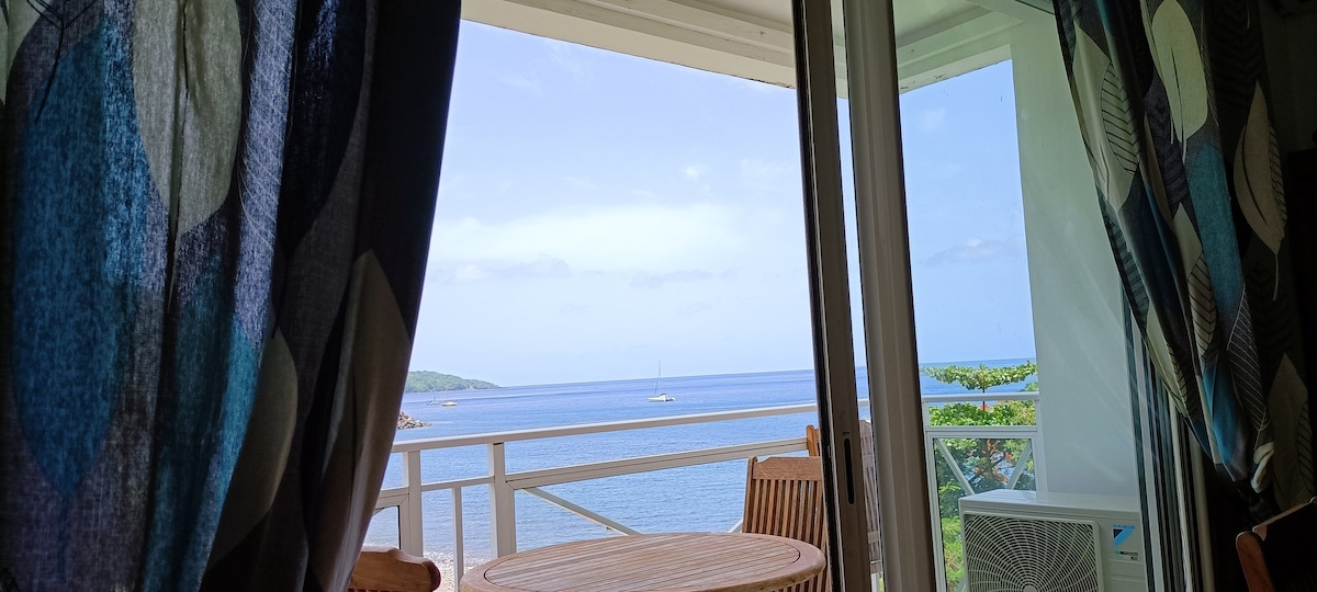 Small quiet studio 14 m2, facing one of the most beautiful bays in the world, on the beach of Anse Mire 8 minutes walk from the pier, often available from 10 am on request. Bedroom: 140 bed, sink, linen provided, towels, Wifi. Corner: Fully equipped kitchenette, shower , toilet . Large ext terrace, sea view, table 2 chairs, sunbeds, outdoor shower garden furniture... This place is great for a getaway in Terre de Haut . This home is attached to the house . Check-out 2:00 p.m.