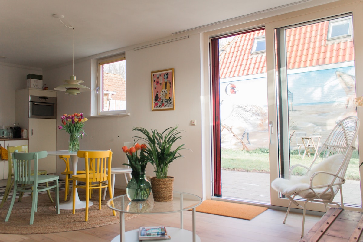 Appt Kip 2 is a four-person cottage and is part of Kip of Eiland, a colorful guest house with a total of 7 cozy apartments in Hoorn Terschelling. There are several seats in the garden and an extra garden house where you can hang out and play games, and it also has a veranda with various fireplaces. Children can play undisturbed in the fenced garden. It is located 1800 meters from the beach and 1500 meters from the mudflats. Directly located on the forest and dune area.