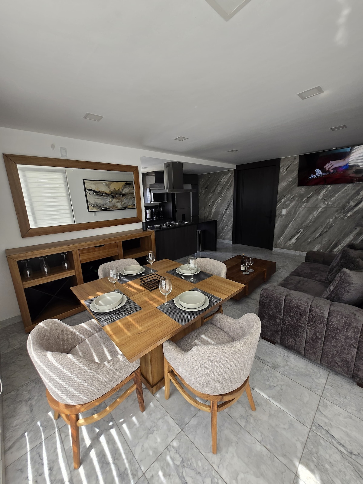 New and modern building with the best location, the apartment has a spectacular panoramic view! The privileged location is 10 minutes from Plaza Andares, 10 minutes from downtown, 5 minutes from Chapultepec, 10 minutes from the Expo, and 5 minutes from Providencia. 24-hour security. The apartment is decorated and equipped by designers to give you a comfortable experience during your stay. Independent air conditioning available in each room and in the common area.