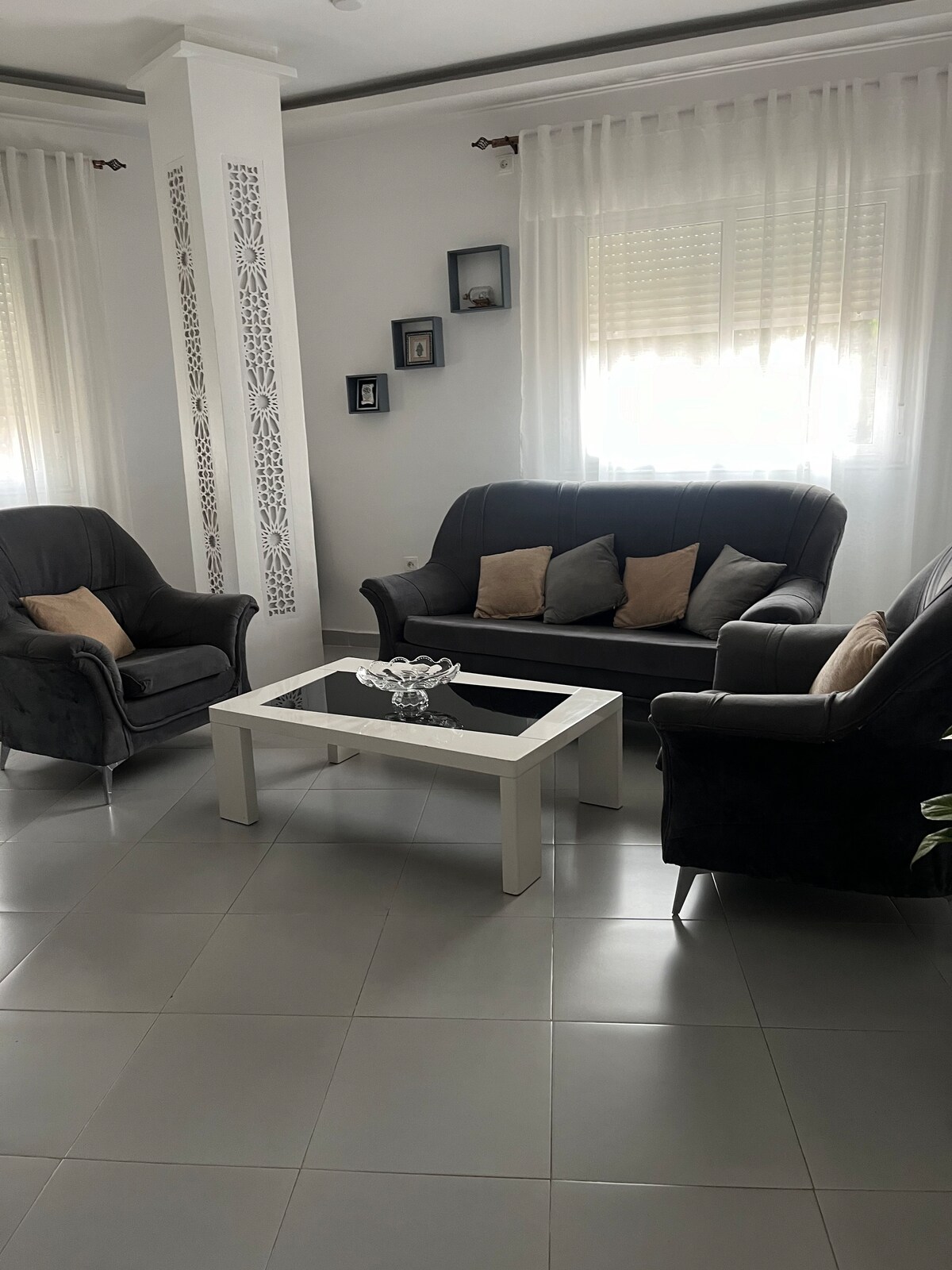 A chic and spacious 4-bedroom apartment located in Les Palmiers, one of the most popular residential areas of Oran. Ideal for families and business travellers. It has 3 comfortable bedrooms, a large fully equipped kitchen, 2 modern bathrooms and a large balcony furnished with table, chairs and barbecue. Fully equipped accommodation (Wi-Fi, TV, air conditioning, appliances). Close to all amenities, quiet and secure.