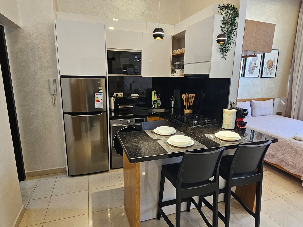 Appartement luxueux et central. Il offre une chambre avec un lit double et espace de travail, un salon avec canapé-lit pour accueillir un 3eme visiteur , TV connectée , une cuisine américaine équipée et une salle de bain moderne. À 7 minutes de place moulay mehdi, 5 min de hamama, 10 min des portes historiques de la medina et proche des cafés, commerces et services. Idéal pour découvrir Tétouan.