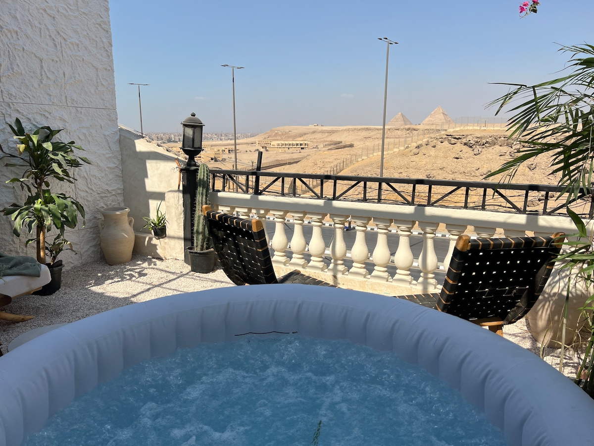 Welcome to your private rooftop retreat in the heart of Giza! This charming studio sits on a spacious rooftop, offering breathtaking views of the Pyramids—perfect for sunrise coffee, sunset lounging in the hammock, or soaking in your very own jacuzzi under the stars. A fully equipped kitchen Comfortable sleeping and relaxation area Private entrance for your peace and privacy Whether you're here for adventure or relaxation, this studio offers the perfect mix of comfort, and unforgettable view.