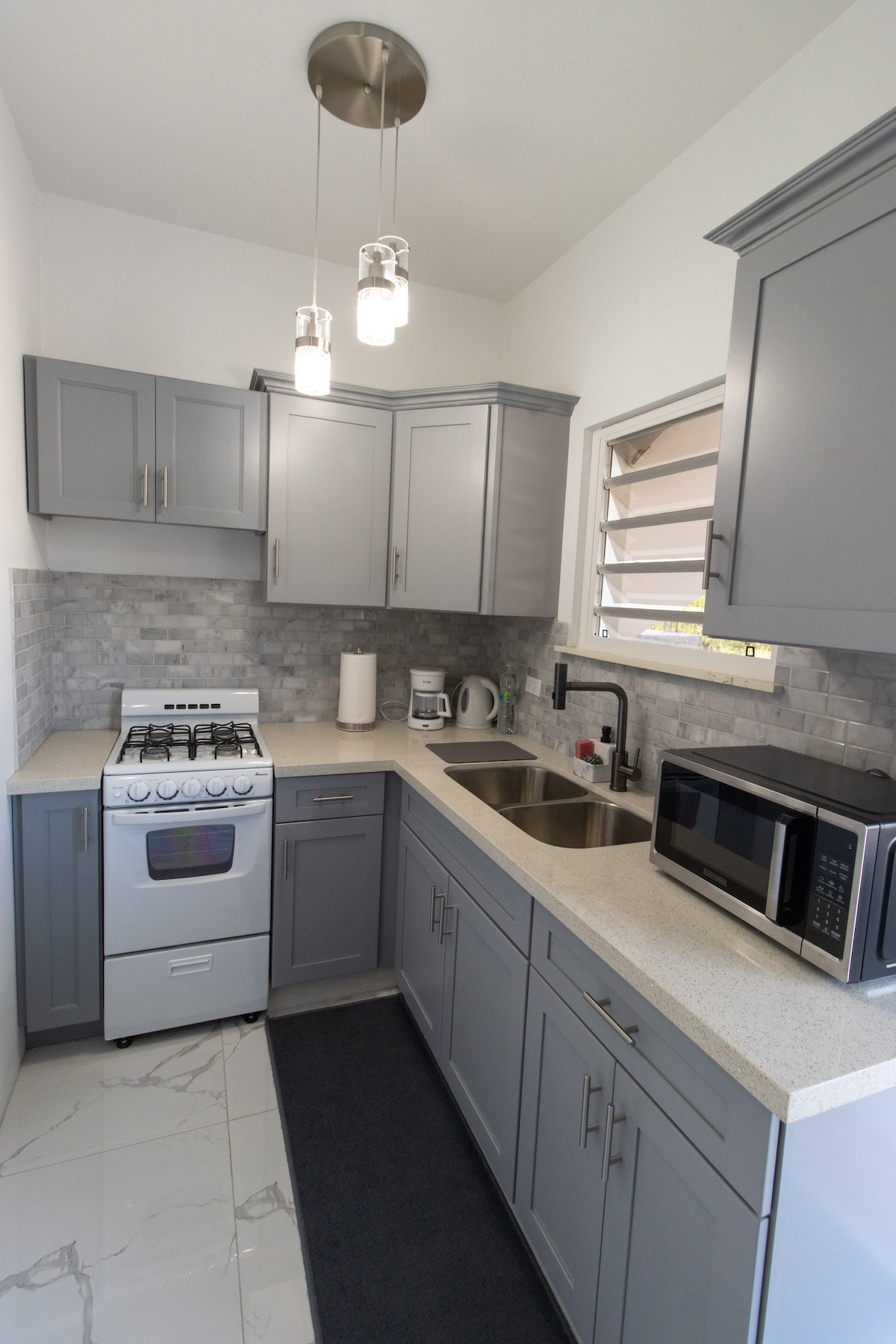 A beautiful, newly constructed one bedroom house with modern styling. Highlights include fully air-conditioned space, king sized bed,dual 55 inch TVs with full IPTV channels and streaming services, security gate, security cameras on property, fully equipped kitchen, laundry room with washer and dryer and much, much more. The property is located centrally but offers utmost privacy. No expense was spared to provide a unique, high end experience for your pleasure. We look forward to welcoming you!