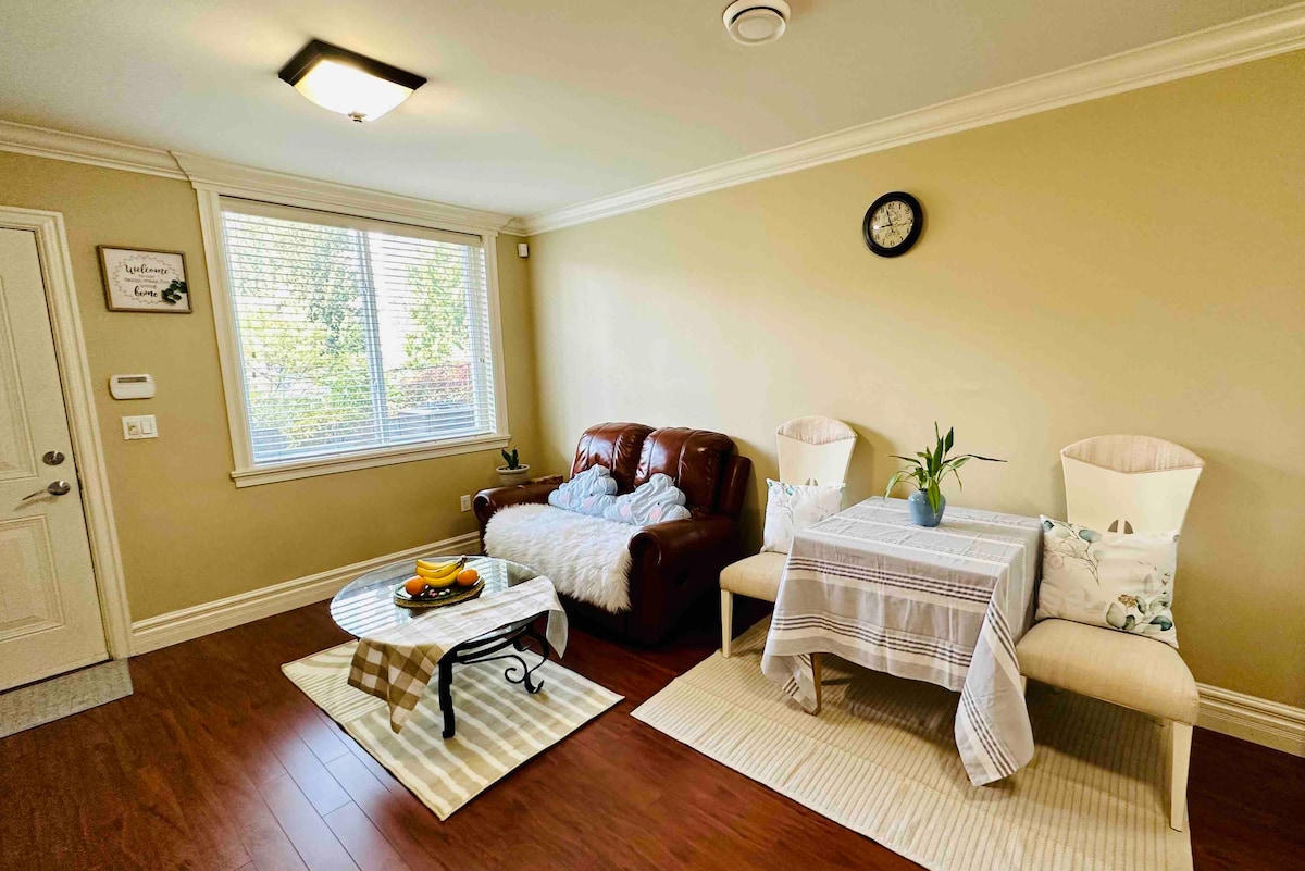 A spacious suite with lovely garden, offers full kitchen, open concept dining/living room area and a private bathroom. Sleep well on a queen bed with fresh white linens and heavenly pillows. Enjoy free wi-fi, watch your favourite Netflix movies in a huge TV with a warm electric fireplace. Morning coffee and bottles of water are complimentary! Located in a quiet neighbourhood with free parking space. 20 minutes drive from/to Tsawwassen Ferry terminal. 30 minutes drive from/to YVR airport.