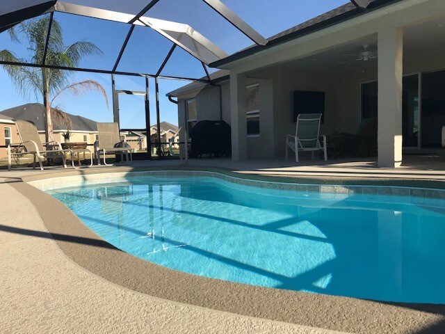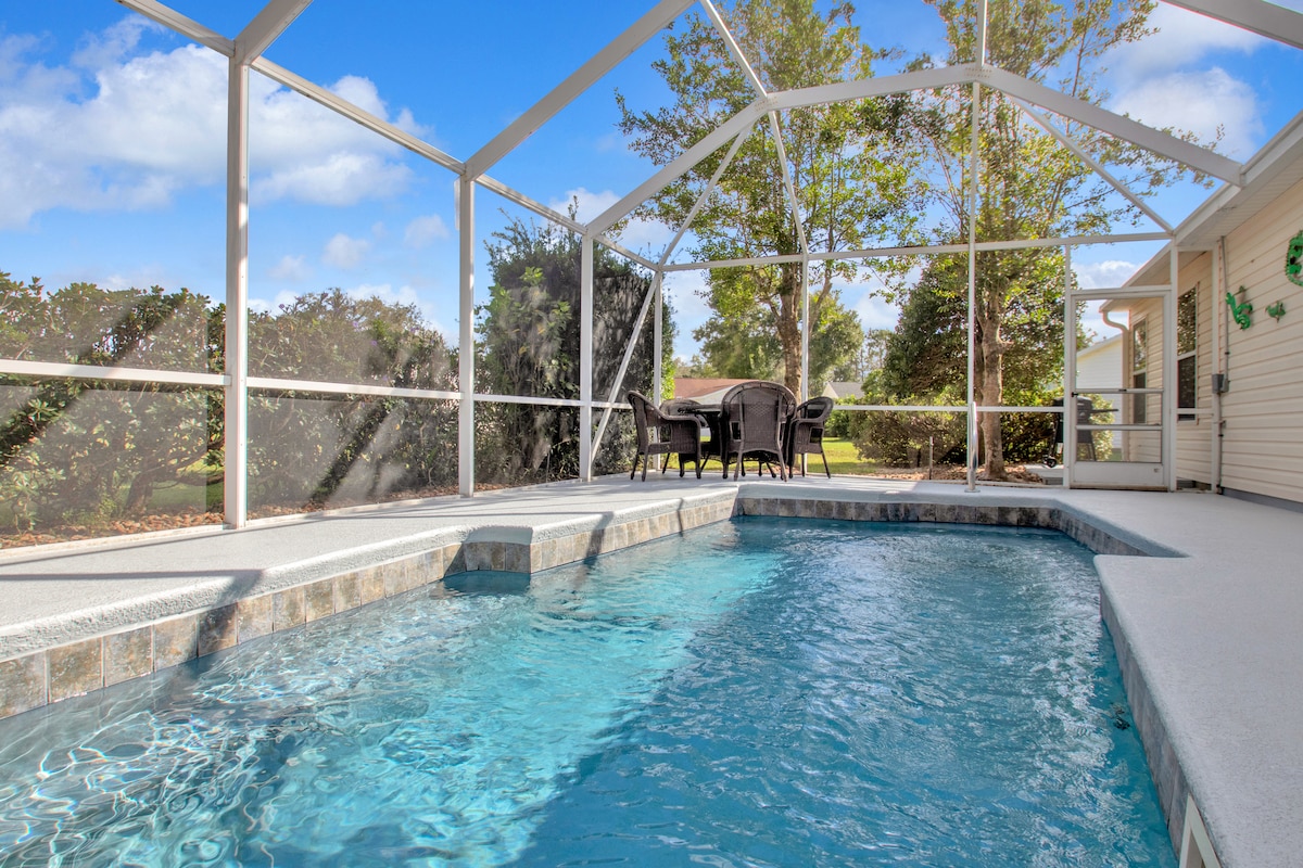Enjoy your own private sports pool, spa, and climate-controlled lanai as well as all of the amenities that The Villages has to offer. Free executive golf courses, water volleyball, and water aerobics for stays of 30+ days. Pickleball, tennis, billiards, shuffleboard, bocce ball, outdoor exercise equipment and nightly entertainment for all guests. Get to Brownwood town square in approximately 10 minutes. This home is located on a pond with a natural preserve beyond the pond.
