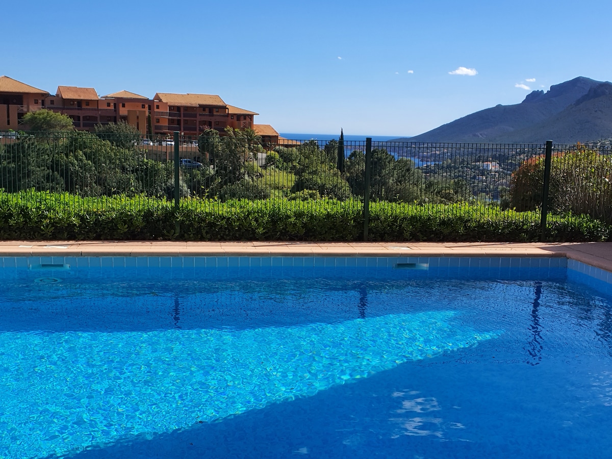 1-star accommodation 5 min from the beaches by car 2 rooms Garden level between sea and mountain, absolute calm. Sleeps 4, separate bedroom and sofa bed. Direct access to the pool with sea views, direct access to the Esterel massif. Furnished terrace and private garden. You will have a secure parking space. All comfort Quality bedding, fast Wi-Fi, flat screen TV, air conditioning, washing machine, towel dryer, refrigerator with small freezer. Sheets and towels are provided.
