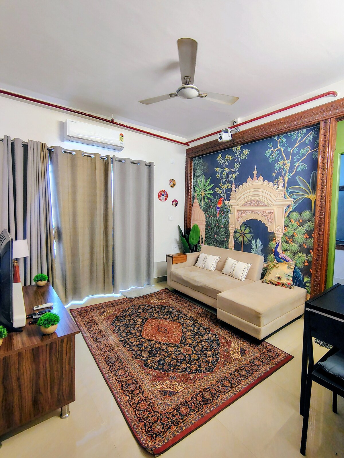 Indian themed compact and cozy 1BHK is ideal for monthly or longer stays. -Couple friendly 🎥 A screen projector for a cinema-style viewing experience. A Sofa cum small bed to enhance your visual experience in living hall with AC 🌆 Located on the 10th floor of a secure gated high-rise near Maduravoyal Flyover. 🌇 A west-facing balcony with stunning sunset views (perfect for your evening coffee!) 🐾 Pet-friendly & family-friendly setup