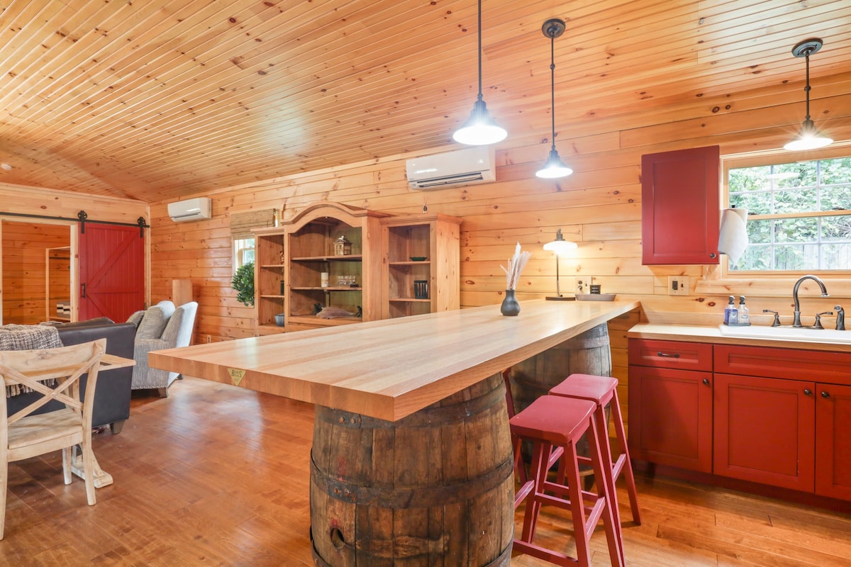 The Ledges Cabin is a luxury stay that sits on 35 wooded acres filled with sandstone cliffs, caves, flora, and fauna. It has three bedrooms and a pull out couch, a full kitchen, a wood-burning stove, and massive windows with a great view of the Ledges. It also has an eight-seat hot tub, a large deck, firepit, plenty of hiking with beautiful rock outcroppings, and a creek that runs through the middle of the property.