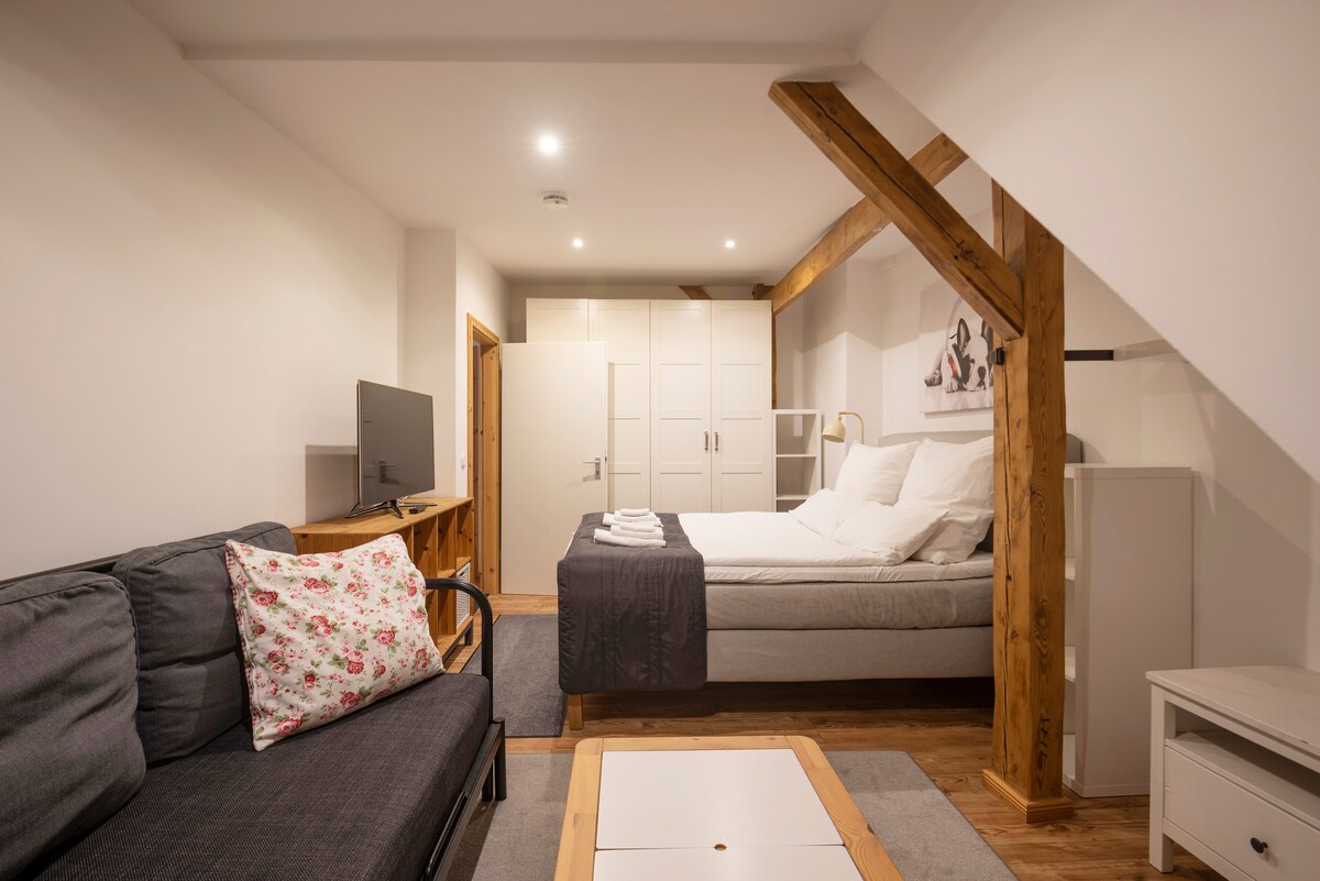 Warm & quiet 40sqm apartment with private entrance in a Bauhaus-style townhouse. 🌡️ Underfloor heating fills the space with gentle warmth. Soft daylight from the 4m sliding window sets a calm mood. Step outside to the cozy Terrace for your first morning coffee, feeling the crisp air and peaceful garden around you. Perfect for slow mornings & cozy evenings. ⚡ Very fast WiFi · 👥 2 guests · 🍳 fully equipt Kitchen · 🧺 Washing Machine