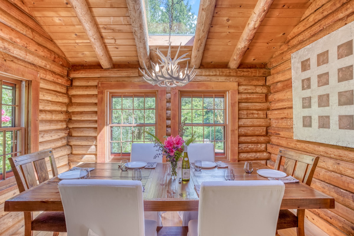 A real log cabin retreat awaits, nestled beside 5 acres of lovely forest, 10 min drive from Nehalem Bay/beaches, minutes from the river. Rustic & cozy, with modern amenities for a comfortable, relaxing stay. Enjoy a soak in our ‘Cadillac’ spa + all the bells & whistles! Forty jets! Create a feast in the fully-stocked kitchen; watch flames dance in the wood stove. Wander forest paths; star gaze on the deck. Great for a small family, a friend group, perfect for two or just you! Birder's paradise!