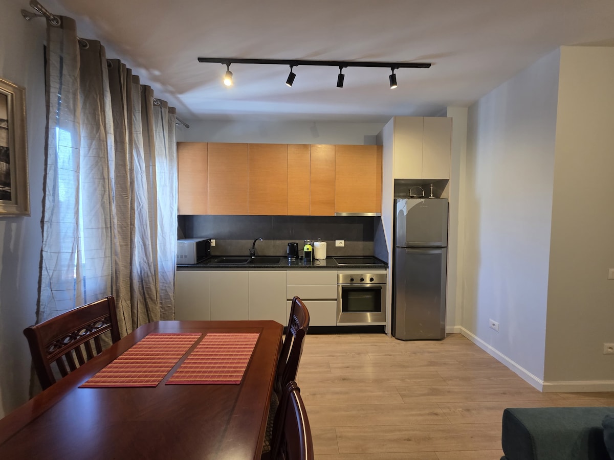 Great apartment at the heart of Tirana, with great views, natural lighting and with a spacious Terrace upstairs that you can view the city (during night the sky is magical). A modern design with a touch of wooden warmth and spacious rooms. Located at just a 4 minute walk from center and with connection through all of Tirana's main streets makes this appartment a good choice for guests that want to experience the city's cultural attractions, museums, parks, restaurants and Tiranas nightlife.