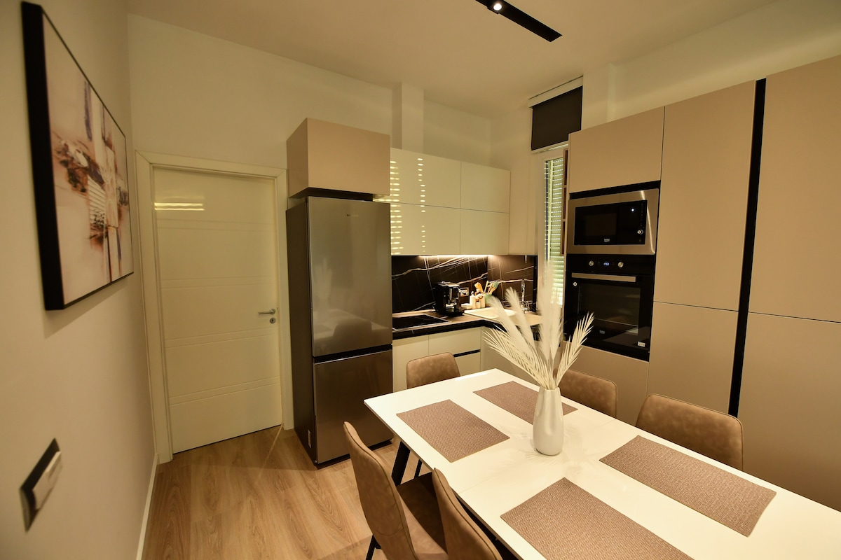 80 m². Ideal for those who need to stay in Tirana for Business, for medium long term and need a private office. All the comforts and privacy of a private apartment with hotel services: daily cleaning, bed linen and towels, fully equipped kitchen, wifi, breakfast and 24/24 assistance. TV with satellite channels and Apple TV with free Netflix. The two-seater sofa bed can be opened and used as a comfortable double bed.