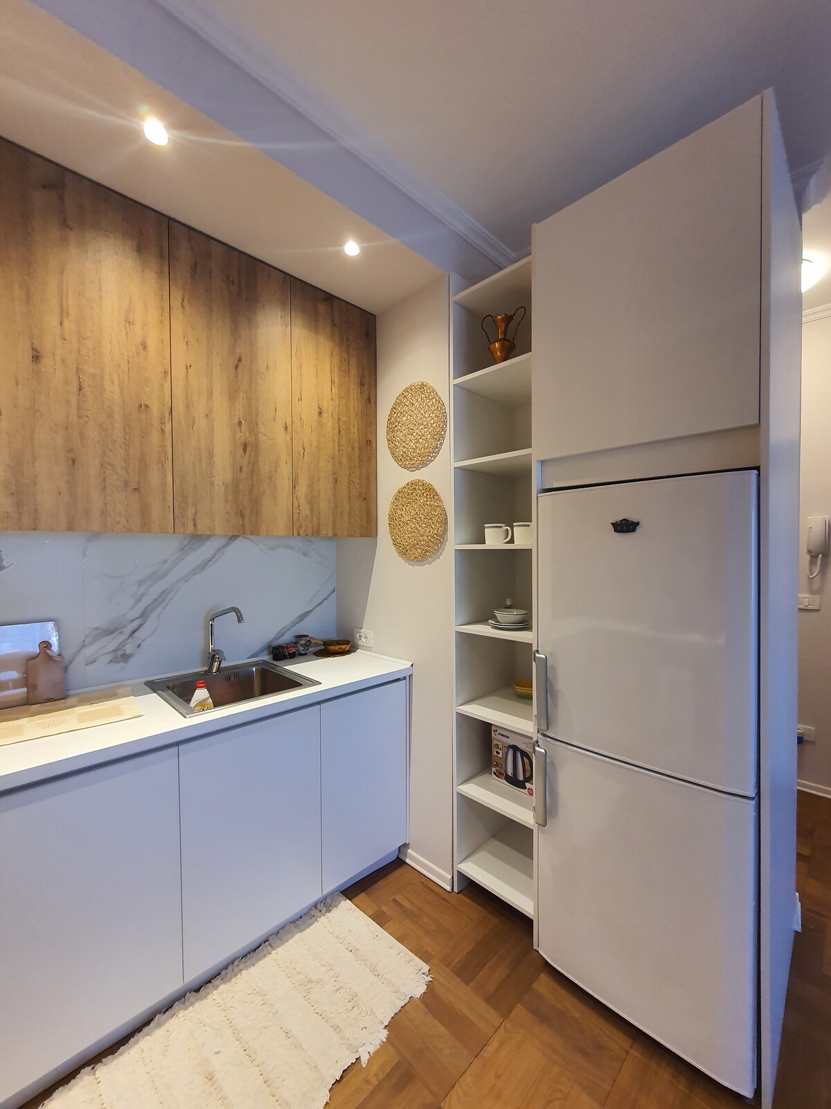 Stay in comfort at this modern and thoughtfully curated apartment, just a 5-minute walk from the city center of Tiranë, perfect for 3 guests. Enjoy stylish open-plan living with a dining area and a cozy balcony. The apartment offers seamless access to local attractions and comes with essential amenities like WiFi, AC, a dishwasher, and free garage parking for a worry-free stay. Experience the vibrant culture of Albania right at your doorstep.