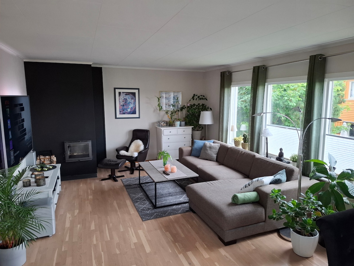 Modern and attractive house with 3 bedrooms. The house is located quietly, in the middle of a cul-de-sac with a fantastic view over the Larviksfjord, where sea and sky meet. This is recreation for the soul and a good place to be. Live with the sea right in front of you and the beautiful Bøkeskogen right behind. You have everything within reach; Bølgen cultural centre, Indre Havn, beach, Spa, town, restaurants, hiking, coastal path, training, transport. Everything within a 5-10 minute walk.
