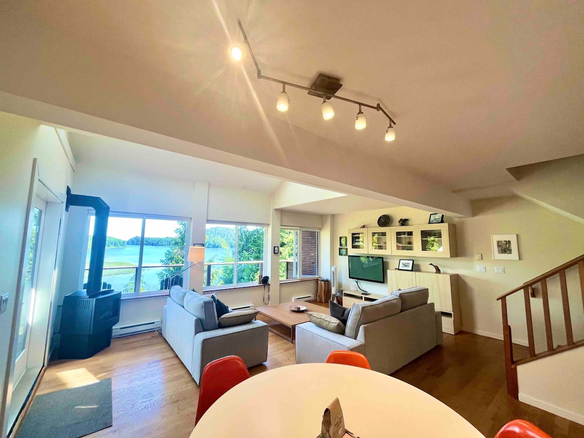 Note: This is a licensed Airbnb & not impacted by BC changes. Spectacular ocean views, and that famous sunset & sunrise. This top floor loft condo is perfect. Vaulted ceilings, big dining table, comfortable, steps to the water. Walk to shops, restaurants, and everything in downtown here at the Tofino harbour. Surf, bike, eat, and relax at home by the ocean. Loft condos like this are rare! Free parking. Grocery & liquor store at your doorstep. Beautiful views. All the popular spots nearby!