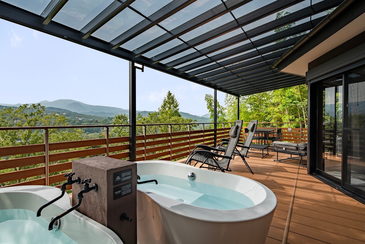 伊東の静かな高台に佇む、雄大な美景が広がる一棟貸し別荘。 眼下には一碧湖、正面には大室山をのぞむ広いウッドデッキテラス。本格的なプライベートサウナ、天然温泉の露天風呂、水風呂を設え、極上の「ととのい」を体験していただけます。 サウナでは超高熱度の本格的フィンランド製harviaのサウナストーブを採用。リモコンで簡単に温度調節が可能、低温でも汗が吹き出るサウナです。オリジナルブレンドの精油アロマでお好きなだけロウリュを。身体の温まり方が違います。窓からは大室山や伊東の山々の絶景をお楽しみください。 サウナ小屋横にはシャワーにスタイリッシュなバスタブ。地下から汲み上げられた冷たい天然水で冷水浴を。天然温泉の露天風呂としてもお楽しみいただけます。 豊富な湯量、滑らかな湯ざわりの泉質で伊東温泉の中でも高い評価を得ています。 思い思いの食材を持ち込みいただき、絶景テラスでBBQ。※別料金 火力が自慢のweber製本格的大型ガスグリルをご用意しております。 オプションで豪華なお肉と地元野菜の食材セットも手配可能です。 リビングルームにはルームシアターを設置