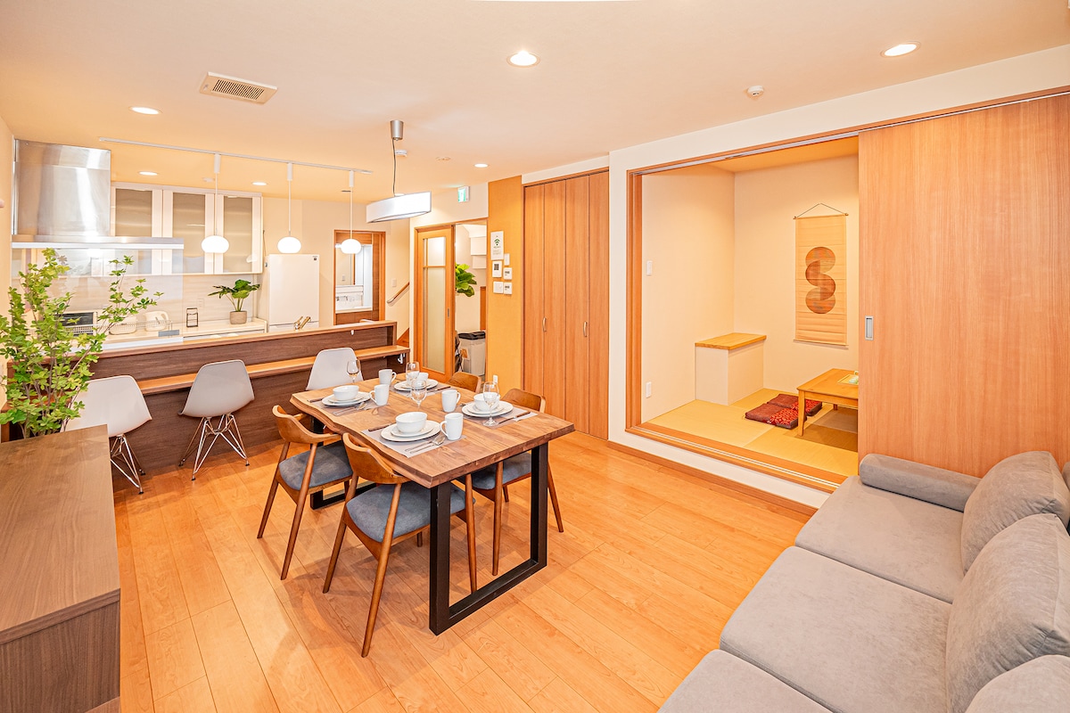 Fujishuku is a new modern high-end villa carefully built by the host, located at the north exit of Shin-Koiwa Station, Katsushika-ku, Tokyo, a 9-minute walk to the prime location, allowing you to stay away from subway noise and car exhaust, and rest better every day. Great location - Close to all attractions and very convenient transportation - two train lines pass through here. [House Profile] Location: 9 min walk from the north exit of Shin-Koiwa Station, Katsushika-ku, Tokyo. Type: Four-story detached house (small villa), modern and high-end design. [Room Configuration] - 3 private bedrooms + 2nd floor partition (4 rooms in total, all with private door locks). - Huge living room, suitable for group gatherings and family leisure. - Rooftop (4th floor), great for relaxing and sightseeing. - Kitchen - Bathing Room - 2 toilets - Washstand. - Garage: Parking for vehicles with less than 8 seats. There is a paid parking lot nearby for large vehicles. [Easy access] Tram direct to attractions: 5 mins: Kinshicho (Skytree) 10 mins: Ryogoku 13 minutes: Asakusabashi (Sensoji Temple) 14 mins: Tokyo Station (Imperial Palace Gaien) 15 minutes: Akihabara 17 minutes: Shinbashi (Ginza) 22 minutes: Shinagawa 30-35 minutes: Shinjuku, Yoyogi (Yoyogi Park), Okubo (Korean Street) 45 minutes: Yokohama (Chinatown) 1hr 15min: Narita Airport [Facilities nearby (within 5 minutes on foot)] 24-hour convenience store Drugstore Fruit and vegetable shop 100 yen shop Sushi shop