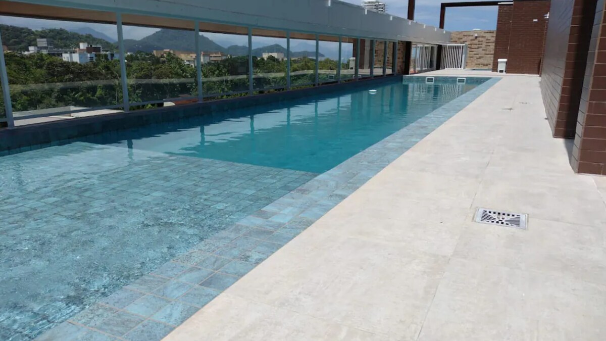 • Beautiful apart, with everything new, modern decorated and with a swimming pool • Living room with Samsung 4K 65-inch smart TV + 500Mb fiber Wi-Fi • Full kitchen with beautiful lacquer design and Brastemp inverse refrigerator • Split air conditioning and Arno ceiling fans in living rooms and bedrooms • Common area on the roof with pool and deck overlooking the sea • 7 minutes from Praia Grande and Tenório, between the north and south beaches • 500m from the edge of Itaguá beach, a popular area