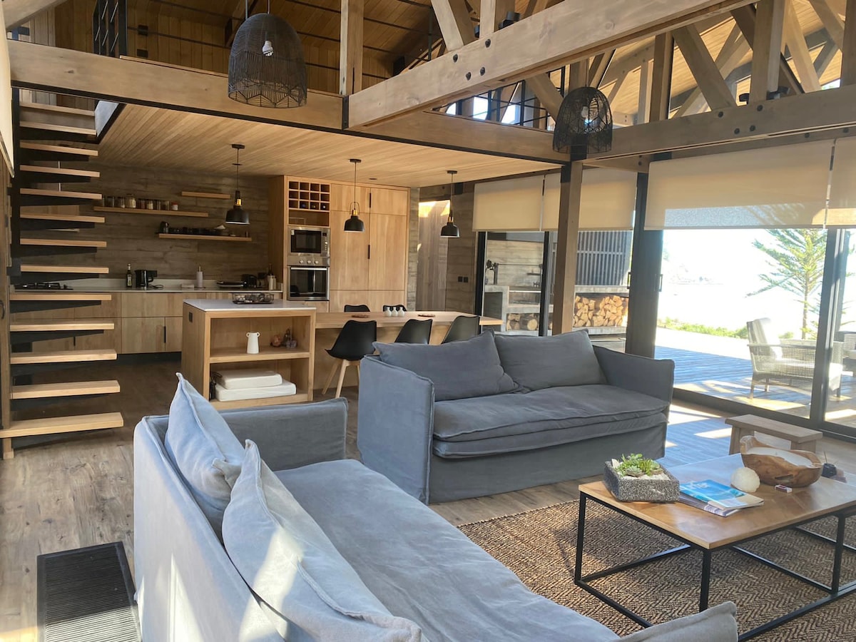 Relax on this unique and quiet getaway. enjoy the sound of waves and the experience of living this house on the front line with spectacular endless pine and another temperate without worrying about the wood. It's ideal for celebrating special moments as a couple with the possibility of accommodating one more child in a second room. Ideal for over 8s, used to swimming pools without railings kitchen looking at the sea and enjoy the sunsets on the immense terrace or the outside quincho.