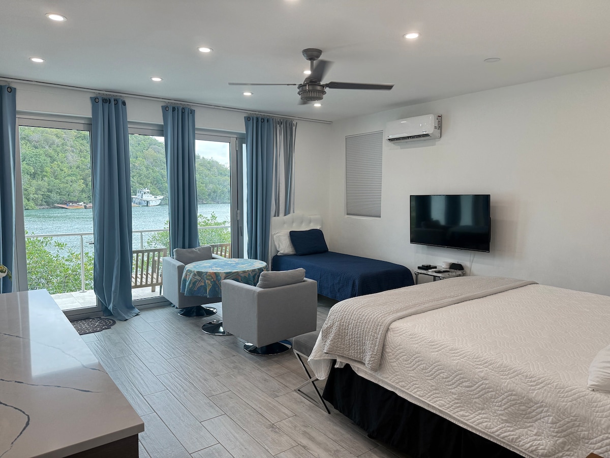FRESH AND UPDATED studio unit in the heart if Cruz Bay at Grande Bay Resort. King bed studio suite with a full foldout sofa, Kitchenette & living room seating area, washer dryer. Amazing view from inside & balcony perched high up on the hill over looking Cruz Bay and surround. Great for a honeymoon, anniversary, or any getaway! Very clean unit & well appointed furnishings. . Wake up to the Caribbean Blue water & sun! Please note. PARKINGis NOT included-paid parking offsite or taxis