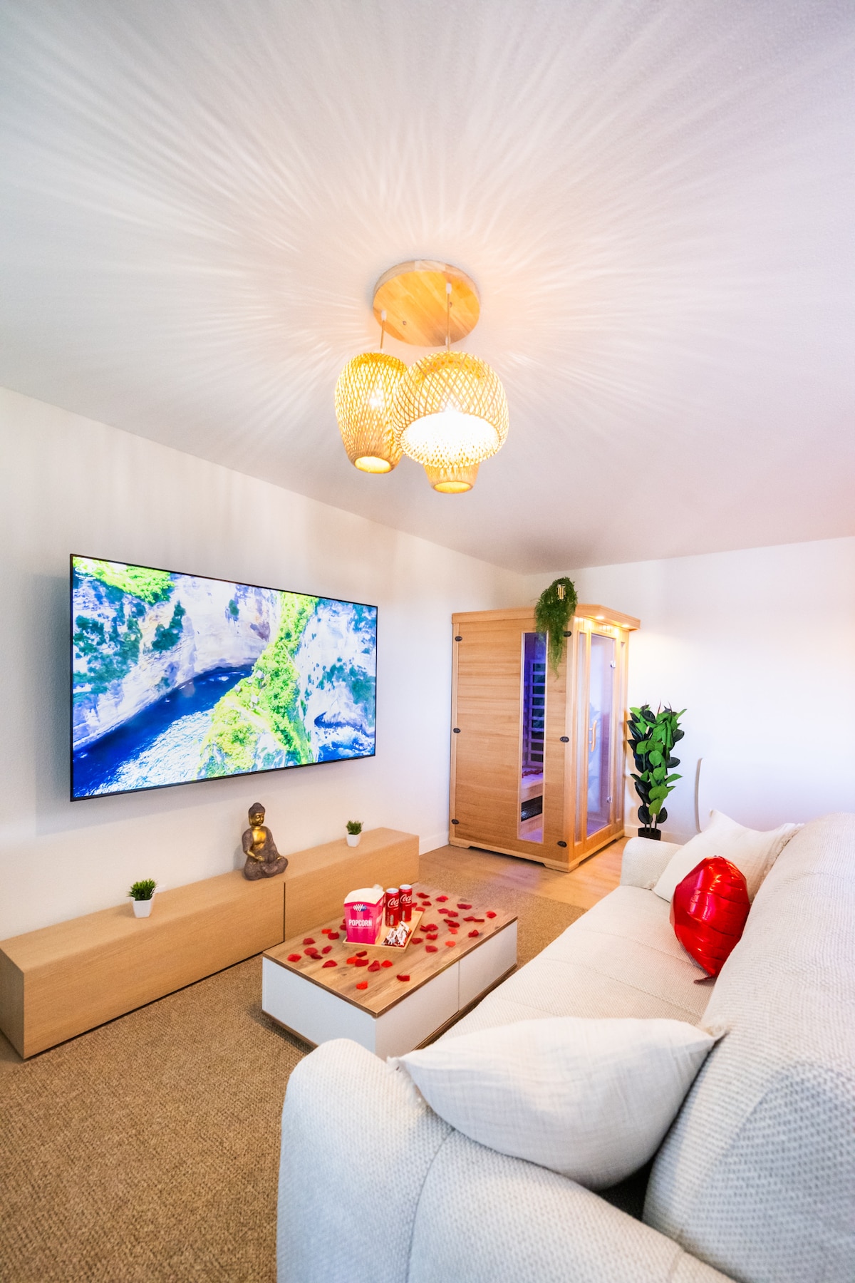 - Balneotherapy 🛁 - Sauna 🧖♀️🧖♂️ - Massage chair 💆♂️💆♀️ - Round Bed / Mirror 🛌 Our Relax Room is specially crafted from a creative and cocooning spirit, we reveal to you the fruit of an exciting work with very special attention to detail. Book now to treat yourself to an extraordinary break filled with memories. Take it easy at this unique getaway.