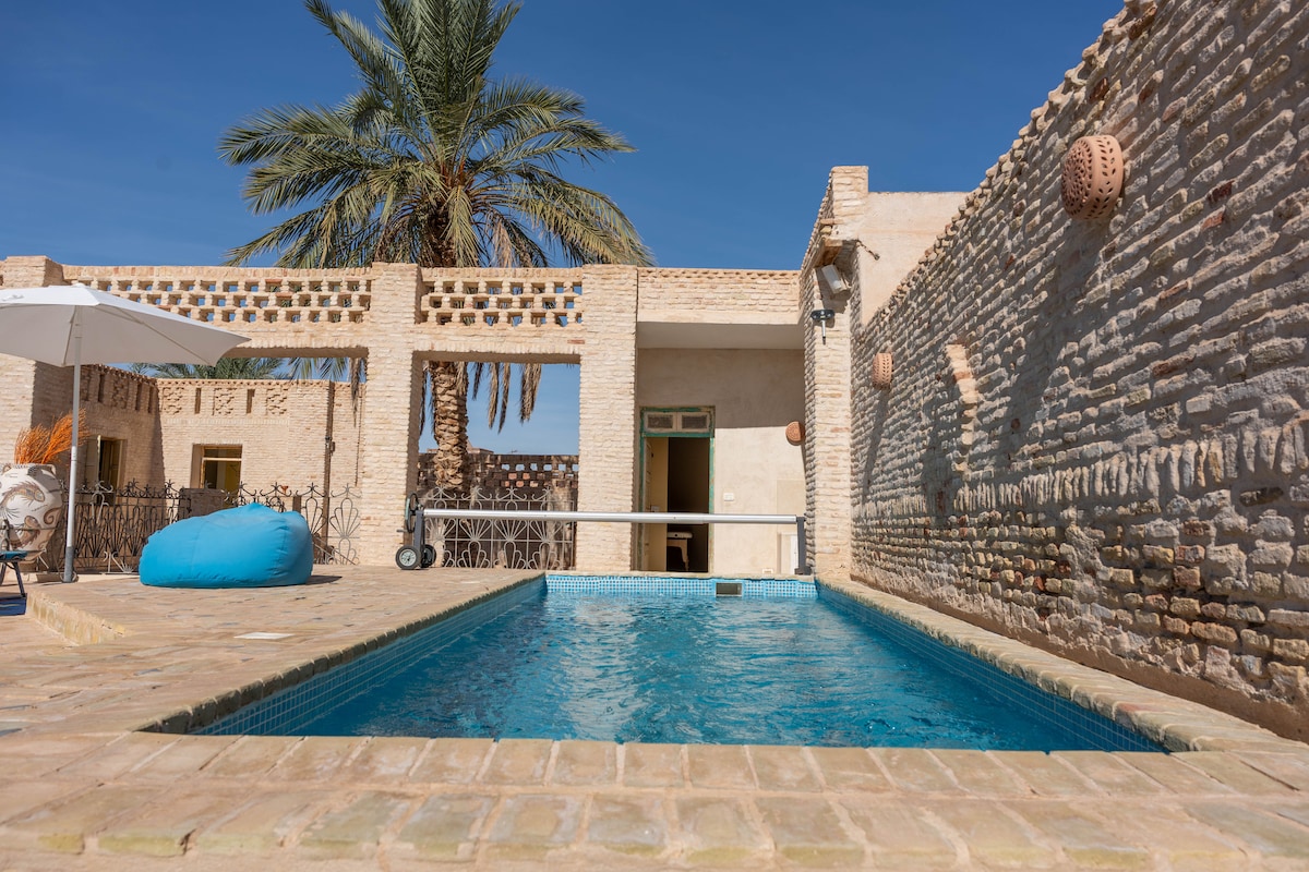 It is a calm and private property recently renovated situated in the midst of a palm tree field, slightly away from town. Adjacent to it is a date factory. The house is equipped with necessary amenities such as a swimming pool, kitchen, and wifi to ensure your holiday is comfortable. Meilleure qualité prix voir les commentaires.