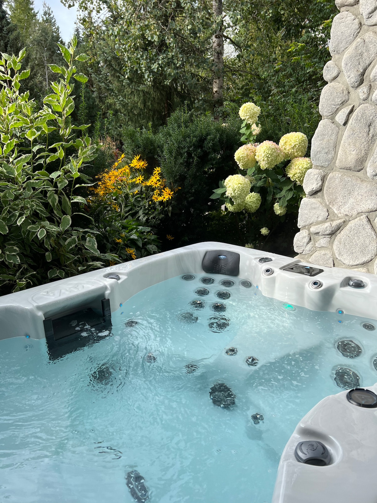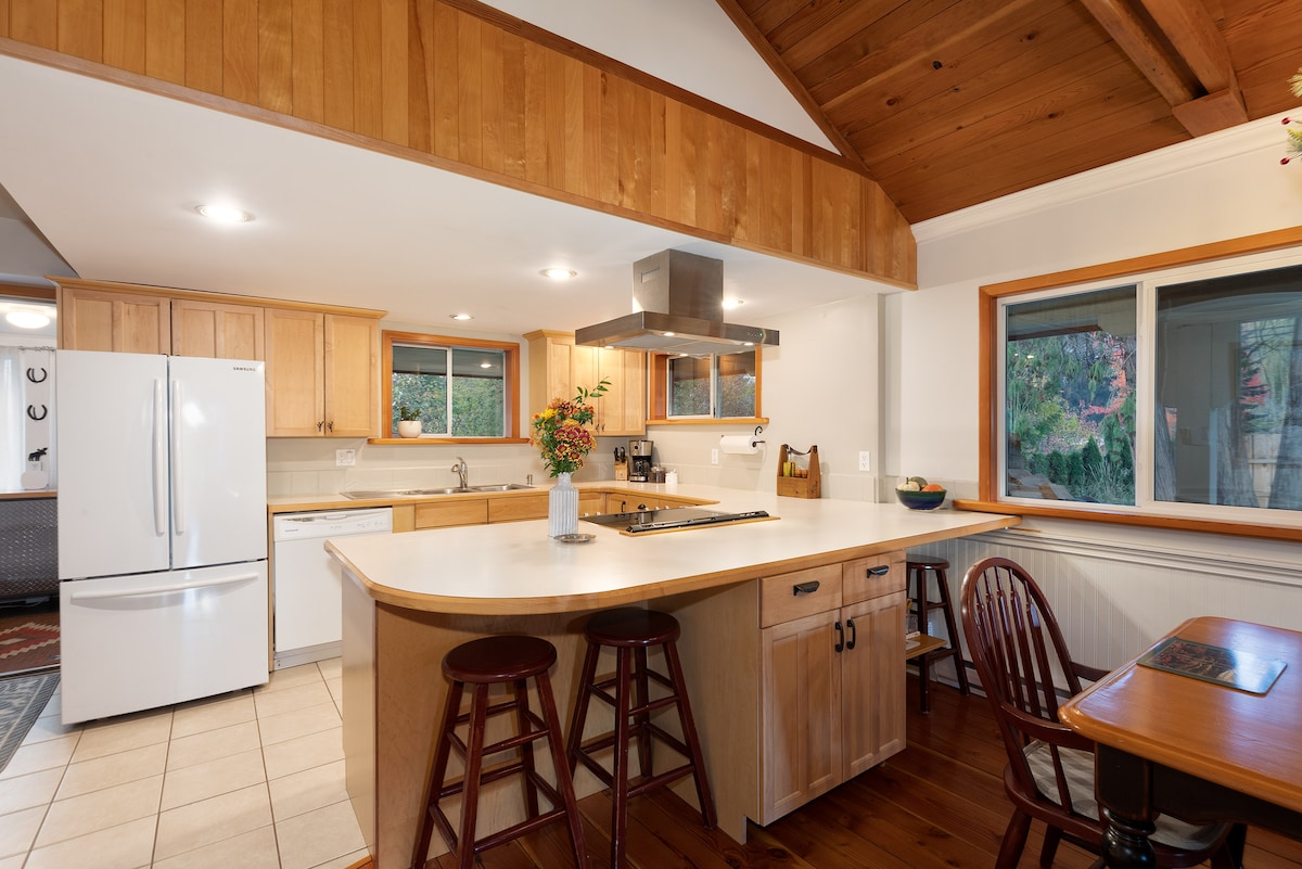 Soak beneath stars in your own PRIVATE HOT TUB, year-round, w/covered deck, cushy deck sofas, propane fire table, glass filament string lights,. Wander a stunning river-side path, where you won’t see anyone. Especially magical with snowflakes falling. Fish the river, ski Whistler, Chief’s kitchen w/fresh spices, homegrown garlic, sharp Henckles knives, gas stove, blender & local pottery mugs! Ultra comfy beds, 600+ thread ct. cotton linens. Complimentary “Chicken Experience” upon request.
