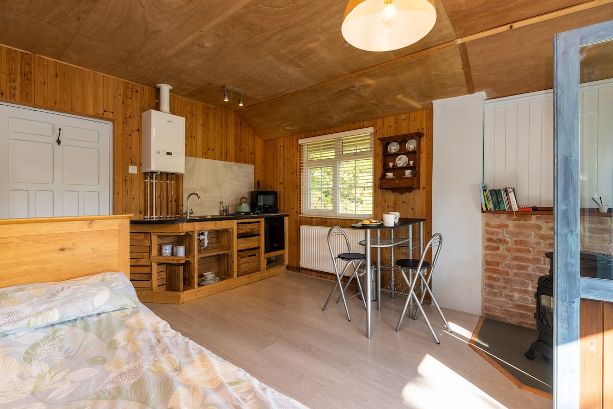 Escape to a cosy, secluded retreat in Cornwall this winter. Our hand-built Shepherd's Hut, Longwool, offers a luxurious, private stay in a newly planted apple orchard on a working farm. Enjoy the king-size bed, en-suite shower room, fully equipped kitchen, and underfloor heating. Warm up by the log burner with logs provided, and take in stunning countryside views from your outdoor seating area. Perfect for a winter escape with similar comforts of a hotel room.
