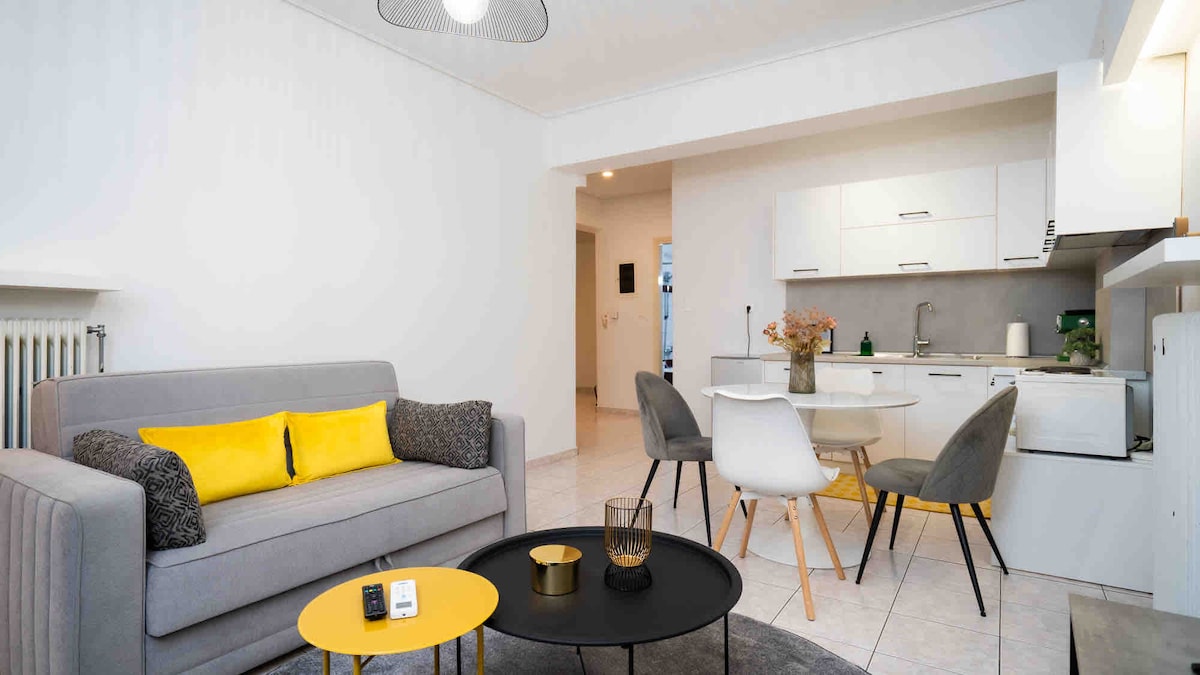 Luckyhome is a quiet, zen, angular, panoramic, spacious and sunny 1st floor apartment. In 3 minutes, you are in the city's museums. Within a perimeter of 50 meters you can find everything: cafes, bakery, pharmacy, supermarket and 10 minutes walk from the main pedestrian street of Asklipiou!Independent heating (gas) and air conditioning. Recently renovated with minimal decoration. Equipped kitchen, parking space always available, under the house. You have a view of a park.