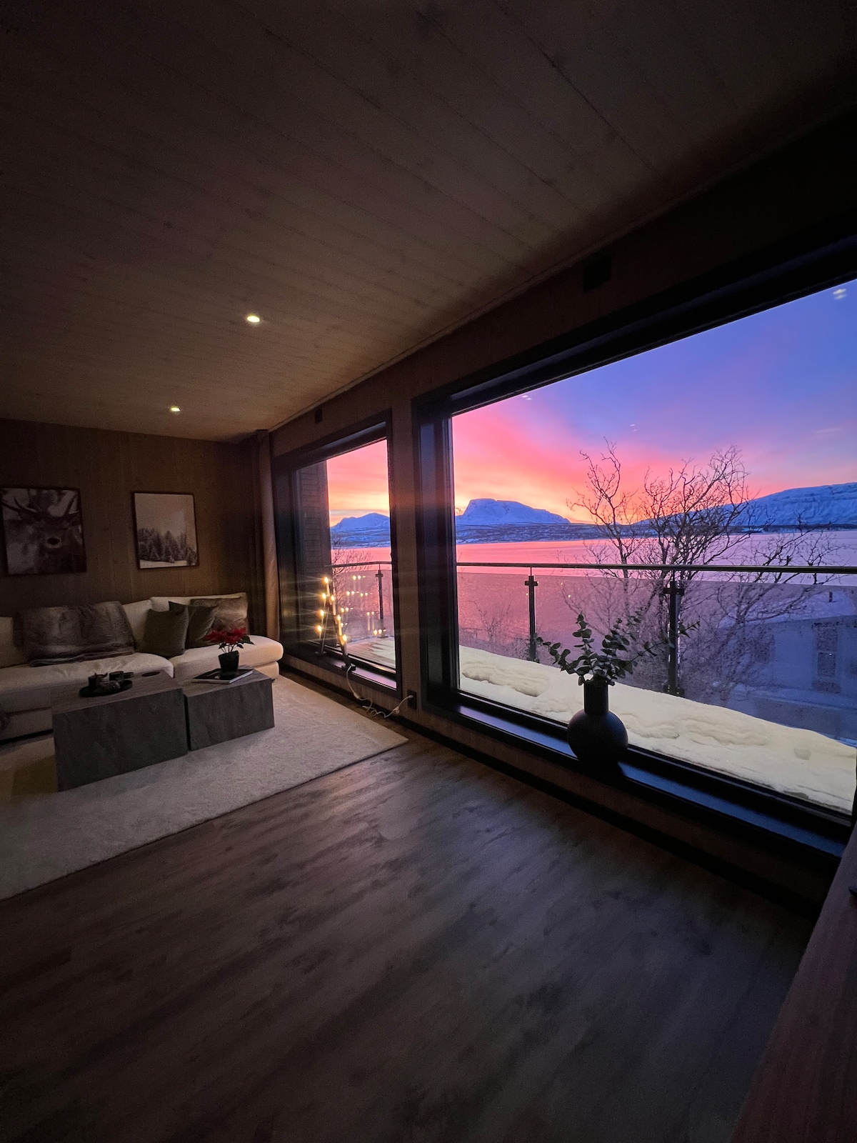 Stylish top-floor apartment by the sea in central Tromsø with an impressive view of the Arctic Cathedral, Tromsø Bridge, Cable car, midnight sun and the Northern Lights. Enjoy Hurtigruta sailing in from the sofacorner and hear waves lapping outside. The entrance is part of a glazed terrace with views to the south. The center is a 10-minute walk away. The apartment is open, inviting, and a nice & comfortable place to spend your time. Age limit to rent: minimum 25 years. NO SMOKING OF ANY KIND.