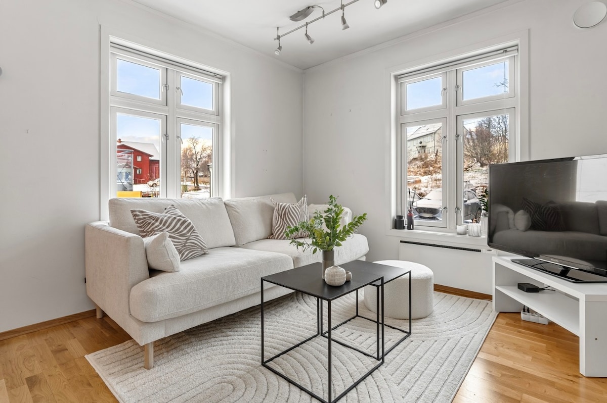 This beautiful and central apartment is located on the 2nd floor and is 43 m2. The apartment contains hallway, bedroom, bathroom with kitchen solution. Det er også en privat balkong. Vervet area is a newly developed district in Tromsø, with restaurants, cafes right by. The city center is only a 5 minutes’ walk from the apartments, same for the Artic Cathedral across the bridge. The apartment building is modern and placed right by the harbor.