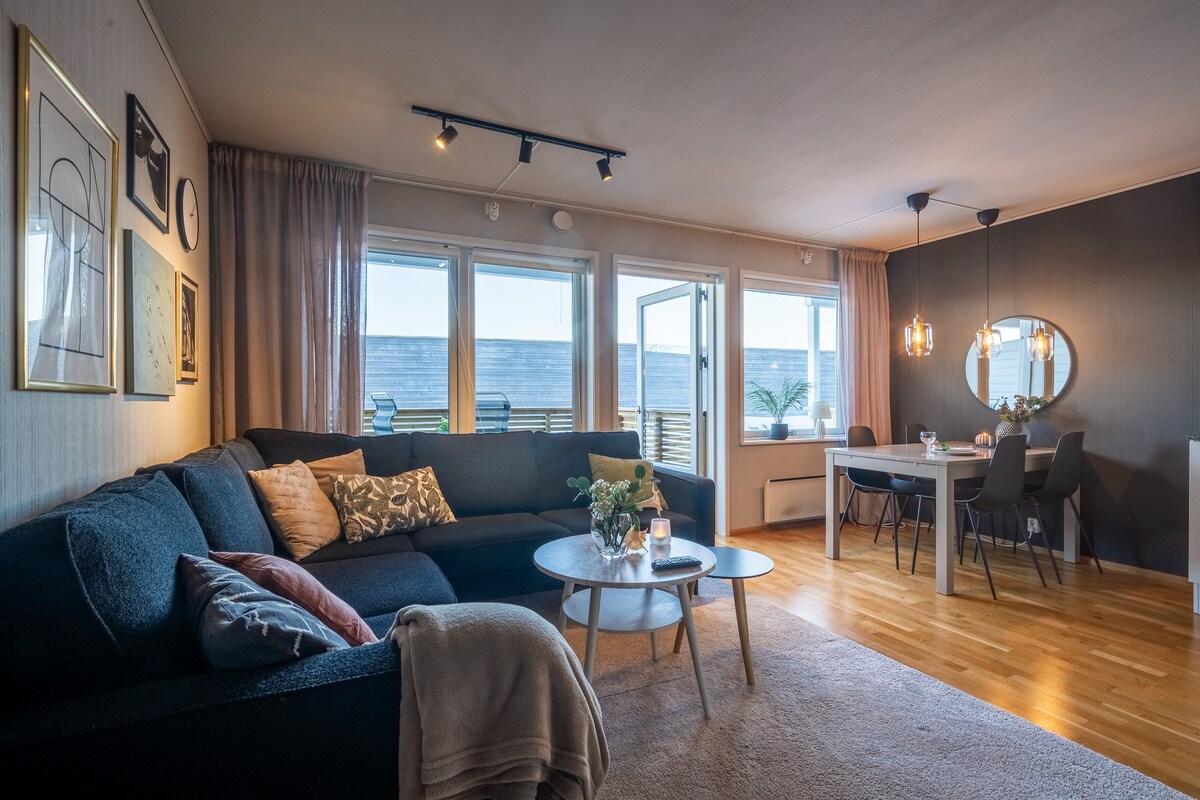 Stylish top-floor apartment by the sea in central Tromsø with an impressive view of the Arctic Cathedral, Tromsø Bridge, Cable car, midnight sun and the Northern Lights. Enjoy Hurtigruta sailing in from the sofacorner and hear waves lapping outside. The entrance is part of a glazed terrace with views to the south. The center is a 10-minute walk away. The apartment is open, inviting, and a nice & comfortable place to spend your time. Age limit to rent: minimum 25 years. NO SMOKING OF ANY KIND.