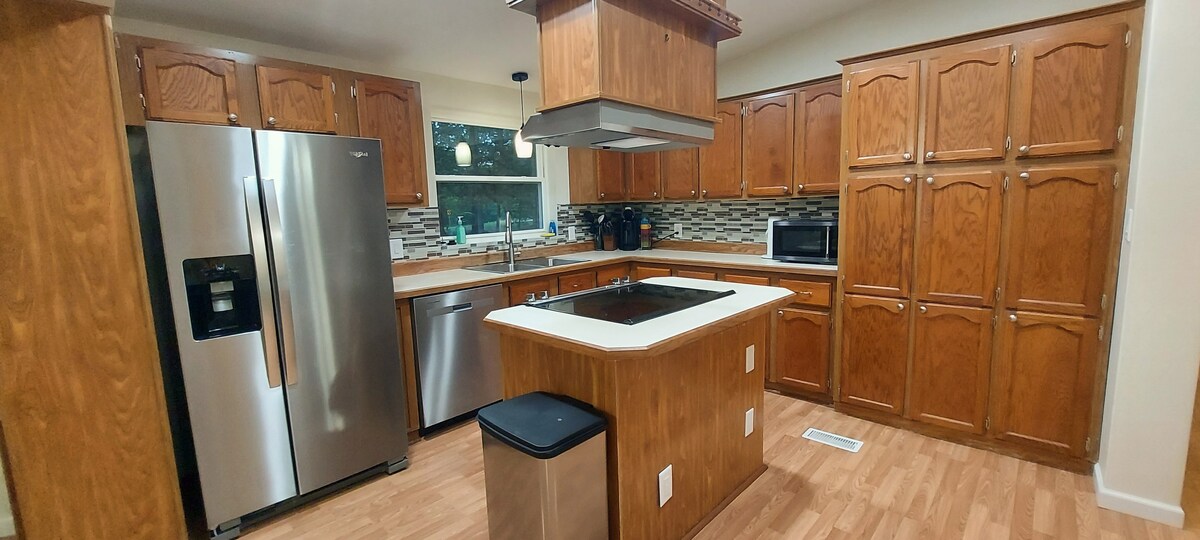 Come stay in our guest bunkhouse! Situated in the middle of 40 acres of beautiful land. We have a pond, and several walking trails on the property. We are only 5 minutes from Truman lake and Lake of the Ozarks! Plenty of parking for your boat or vehicle. This house has 1 queen bed, 1 full size bed, and 2 twin beds. Kitchen has coffee maker (coffee & supplies included), small refrigerator, and microwave. TV with Dish channels. We love fisherman, so come see us!