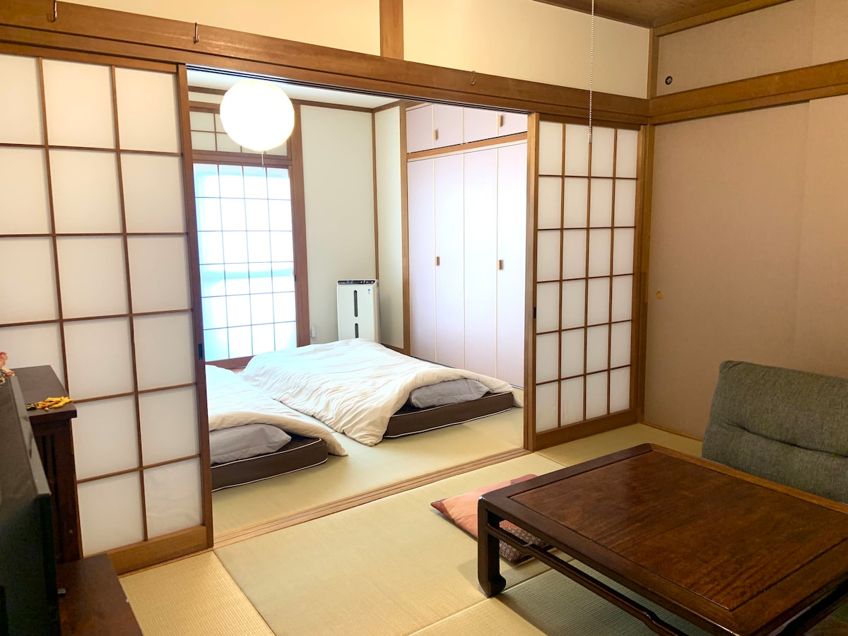 2 bedrooms (one in western style, one in Japanese traditional tatami room), a living room, fully equipped kitchen with dining area, a restroom, a bathroom with a tub and shower, laundry (with detergent), and a balcony. High speed wifi and a portable wifi kit provided. Perfect for remote work and extended stay is welcome. Guest has a private access to the entire flat on 2nd floor with secure entrance of your own. Host lives on the 3rd floor. Ground floor is a small okonomiyaki restaurant.