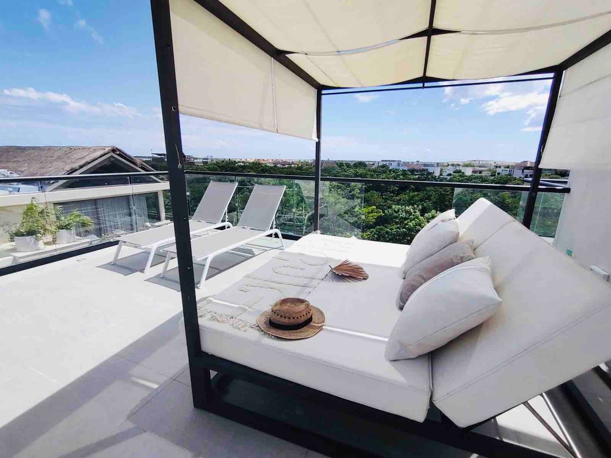 INCREDIBLE 1-BEDROOM LOFT WITH DOUBLE HEIGHT AND DIRECT ACCESS TO THE POOL. ✅Includes 2 Bicycles and Scooter ( checa conditions ) ✅ATV (income) Live the Tulum experience in an eco-friendly design space, surrounded by gardens and with direct access to the main pool from your balcony. Located in one of the safest and most privileged areas of Tulum, with unparalleled amenities, including a natural cenote, fully equipped gym and a spectacular rooftop with infinity pool