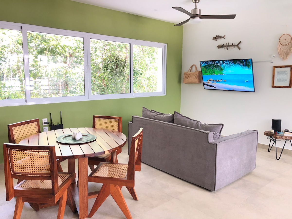 Feel right at home and enjoy all the comforts you expect. This apartment features one bedroom with a bathroom, a fully equipped kitchen, a living room that opens onto a balcony with a private jacuzzi surrounded by lush greenery. Located in a new building with only six units, it also offers a lounge area, terrace, pergola, and shared pool. Just steps away from a lively neighborhood full of great dining options . FREE BIKES to explore Tulum