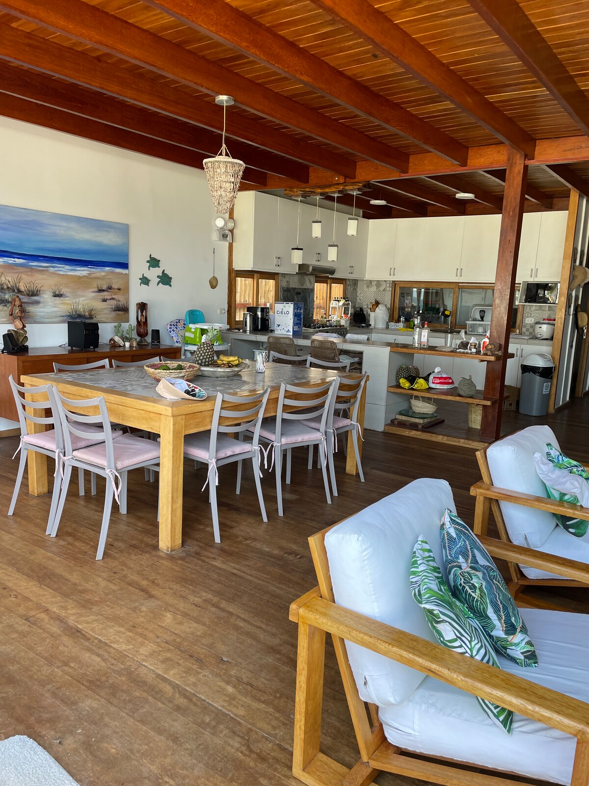 The house is fully equipped and guarded 24/7 Four bedrooms, all with bathroom, double bed, bunk bed, Smart TV with cable, terrace with hammock, all with full bathroom. WIFI It has the attention of a maintenance lady who will make beds and clean. You could also have the service of a chef who will prepare delicious local dishes. The house is on the waterfront, has a nice large branch to protect from the sun, with armchairs, and also has a swimming pool
