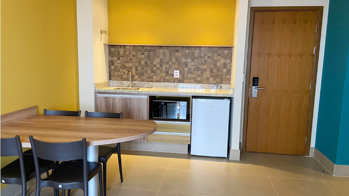 Resort apartment, close to the Water Parks of the city of Olímpia-SP and with excellent infrastructure for family or couple. It is a 1-bedroom apartment that accommodates up to 5 (five) people, and consists of 1 bedroom with 1 double bed and 1 single bed, a living room with a sofa bed and smart TV, a bathroom, a balcony, air conditioning in all rooms, an American-style kitchen with a sink, a minibar and a microwave. Recently opened, this ad is offered directly by a timeshare owner.