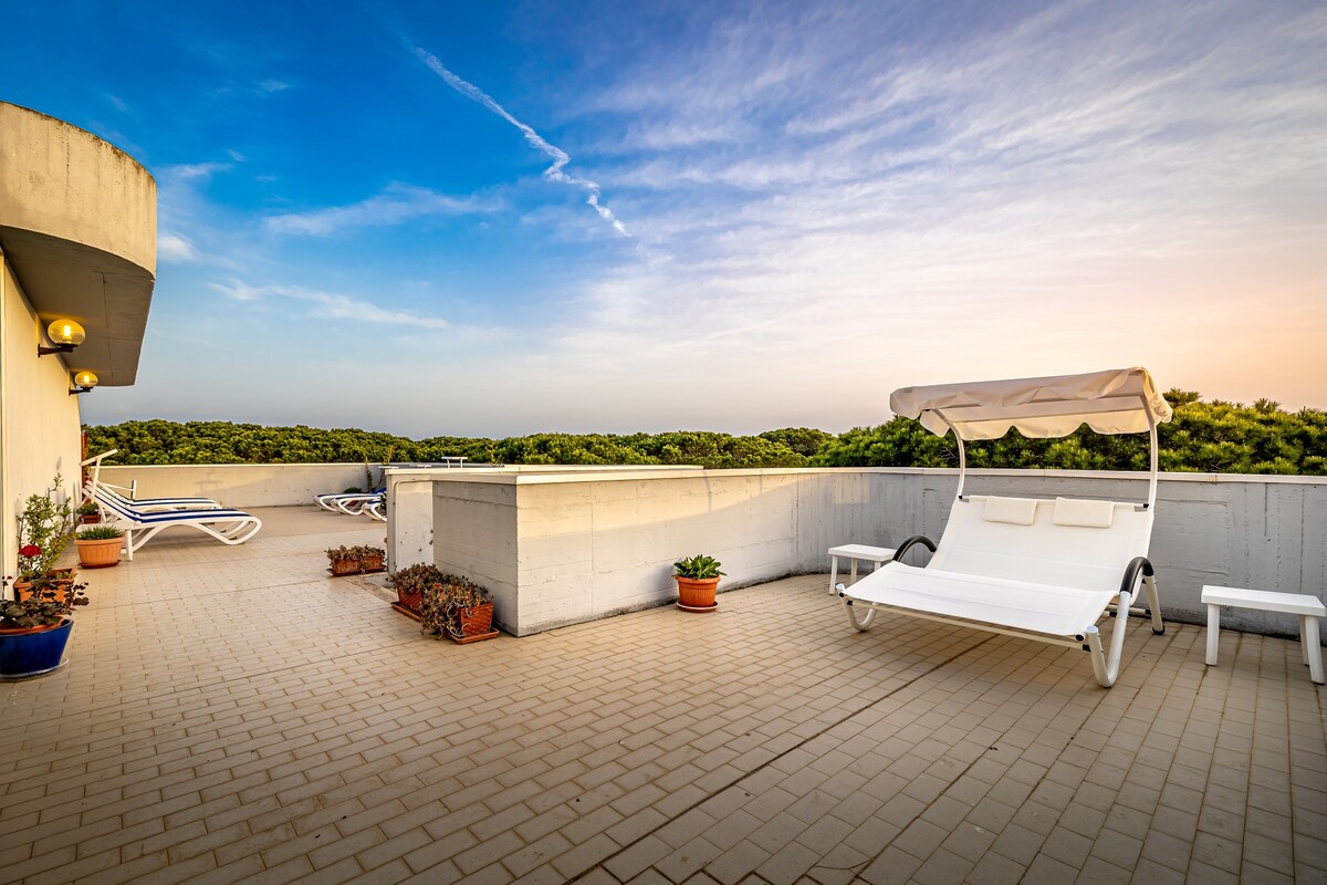 Enjoy a relaxing stay in our cozy first-floor apartment, located above our bar, restaurant and pizzeria, surrounded by the greenery of a large garden with centuries-old pine trees. Just 200 meters from the sea, the location is perfect for those who want a relaxing holiday, good food and nature. Experience the comfort of an independent apartment with the advantage of having catering and tailor-made services just a few steps away from you!