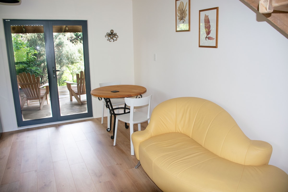 This unique retreat is surrounded by native bush and offers stunning views of the Poor Knights Islands. Our private guest house includes a kitchenette with microwave, kettle, toaster, bar fridge, air fryer, and slow cooker. A tiled bathroom with a walk-in shower and heated towel rails and a large private decking area with BBQ. There is an outdoor shower and drying area for dive gear/wetsuits with plenty of room for those wanting to bring their surfboards or kayaks.