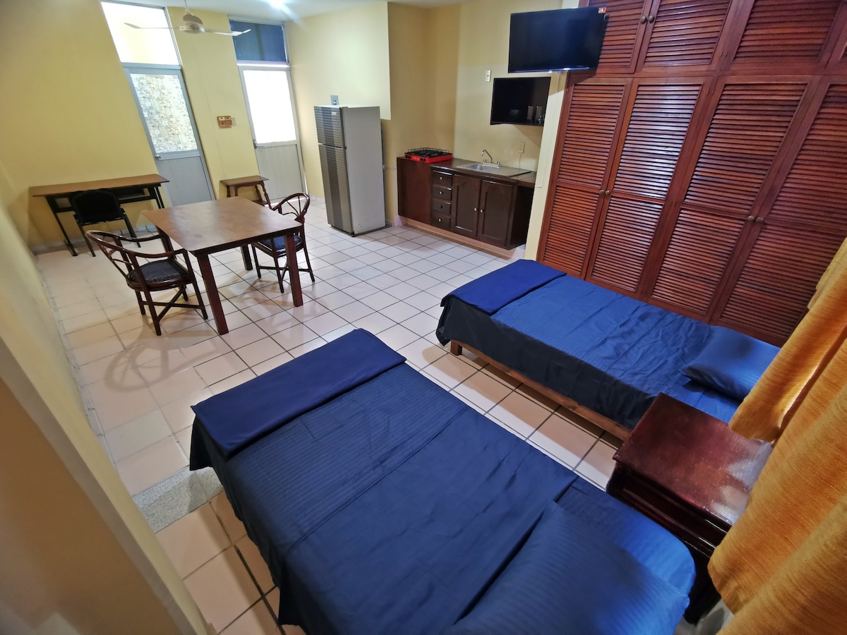Disfruta de una habitación con cama Queen size, baño privado y aire acondicionado. Este alojamiento cuenta con sala y cocina con todo lo necesario para disfrutar de tu estancia. Recibimos mascotas Las reservaciones son únicamente por la aplicación. A 500 mts encontrarás un mercado con comida típica de la región, tiendas de conveniencia y restaurantes. Estamos a 20 minutos de la playa de Tuxpan y 3 minutos del centro Contamos con 1 cajón de estacionamiento privado.