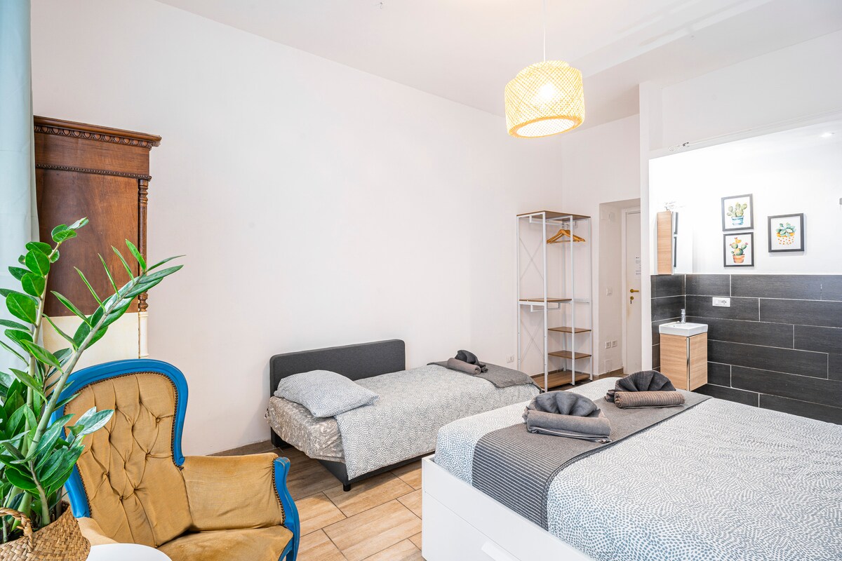 Two-room apartment inspired by Pulcinella, a historic Neapolitan mask of art comedy. Furnished with care, imagination and originality, it is located on the ground floor of the building, behind Piazza del Plebiscito, Teatro San Carlo, Palazzo Reale and Castello del Maschio Angioino. In a typical Neapolitan alleyway, very close to Via Toledo, Piazza Trieste e Trento, and the Port of Naples. Many of the furnishings are scandalous symbols typical of the Neapolitan tradition.