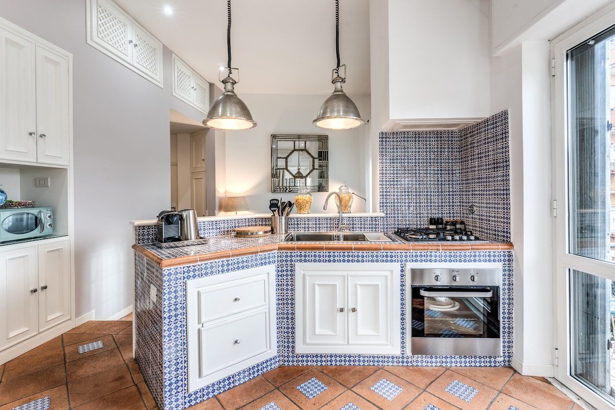 In the center of Rome a private penthouse open louvered window coverings in a living room to maximize light and reveal wraparound views of Central Rome and St peter's basilica. A period fireplace, terra cotta tiles create a traditional feel. Private terrace fully furnished. Two double bed rooms. Ten minutes walk from St Peter's square and Vatican Museums. Overlooking Rome and St Peter's. 2 minutes walk to public transportation, bus & metro will take you easily to all the main historical sites.