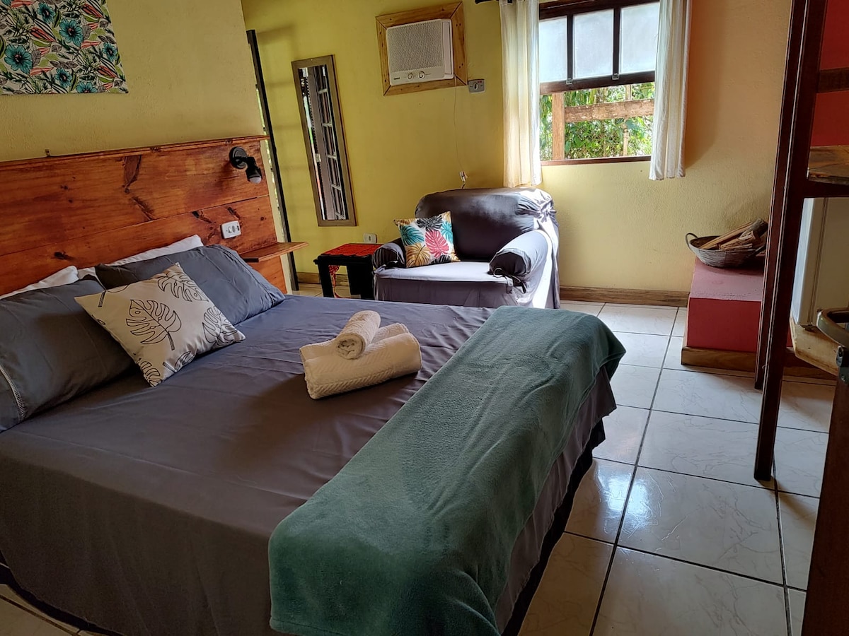 Sleeping to the soft sound of the river. Waking up to the birdsong. Rest in a hammock among the trees. Relax in a pool with icy water that comes from a waterfall. Or simply observe the lush nature that surrounds us. And all this with the comfort of our complete chalet, with private kitchen, bathroom, air-conditioning, cable TV, balcony with hammock, Wi-Fi and parking. We are close to beautiful waterfalls and just minutes from paradisiacal beaches. Market a few meters away.