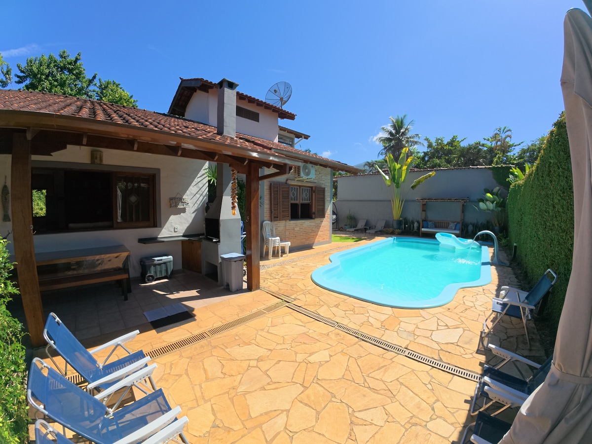 House with swimming pool in a high-end gated community with full security next to Toninhas Beach and very close to downtown Ubatuba. Ponta das Toninhas Condominium in Ubatuba! One-story house with 300 m2 of built area on a 950 m2 plot. There are 4 en-suites with capacity for up to 10 people and a leisure area with a swimming pool. Newly built house with all kitchen utensils. Gourmet area, Home and suites with air-conditioning. For more details, contact the owner.